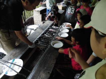 焼いているイワナからジュウジュウと水が滴り落ちます。