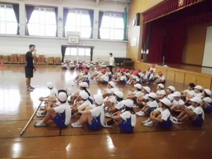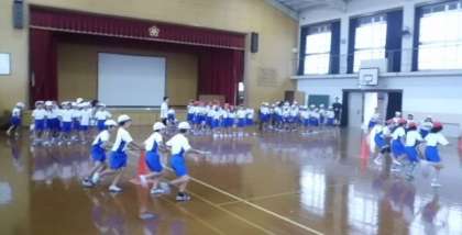 運動会といえば,台風の目です。今日は,3色対抗で初めて練習しました。4人で息を合わせて回るのが難しいですが,みんな初めからなかなか上手にできていました。バーを飛び越えるのがポイントのようです。運動会までまだまだ時間があるので,みんなでうまくできるコツを考えてがんばって下さいね。