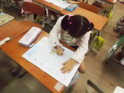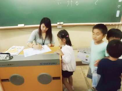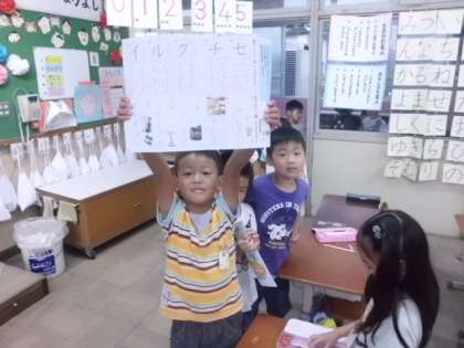 1年生は只今カタカナの学習をがんばっています。1文字1文字ていねいに書いて先生に見てもらっていました。ひらがなと違ってカクカクした感じですが,みんなとても上手に書いていました。