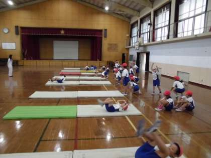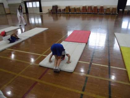 ひざを閉じて,体を丸めてくるっと回り,手を使わずに上体を起こす前転をめざして練習をしています。
