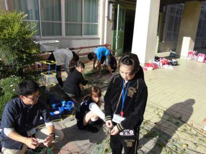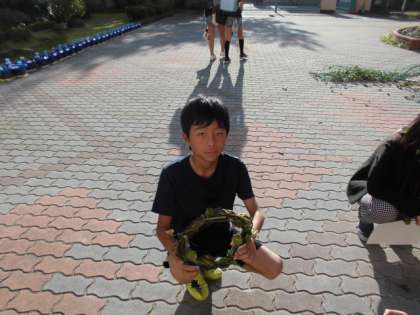 栽培委員会はあさがおのつるを束ねて,きれいにリースをつくっていました。