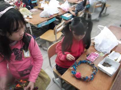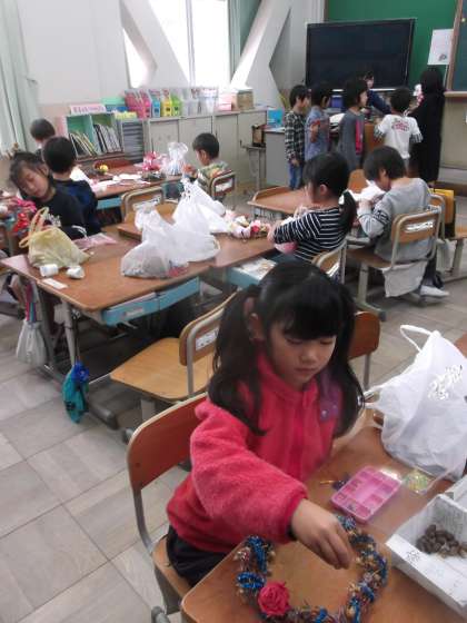 そこに、校外学習で集めたドングリなどをつけて飾り付けをしました。好みのリボンやボタンをつけました。