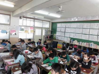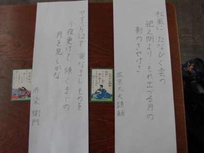 今回は国語で学習した「短歌と俳句」と関連させ,百人一首の中から気に入った短歌を選び,文字の大きさや配列に気をつけて書いたり,声に出して読んだりしました。