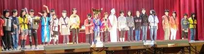天竺を目指す三蔵法師一行,妖怪たちとの対決で悟空や猪八戒,沙悟浄が大活躍します。あの名作をリメークした6年3組の劇は,演技力も抜群で見る人たちを大変ひきつけていました。さすが6年生です!