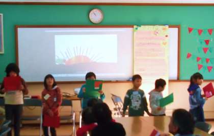 『はらぺこあおむし』のアニメーションに合わせて歌をうたう出し物をしました。みんな大好きなお話でうれしそうに歌ってました。