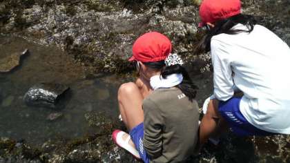 宮崎浜での磯観察。アメフラシやヤドカリなど、たくさんの生き物を見ることができました。