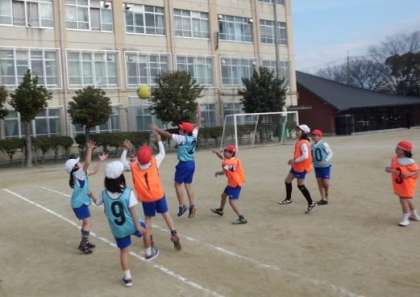 3年生の体育は『エンドボール』をがんばっています。学習が進むにつれて,個人の技術もチームの戦術も高まってきています。みんなシュートの意識が高く,ゴールマンと息を合わせて・・・ナイスシュート連発です。ディフェンスマンもシュートを防ぐべくジャンプ一番,激しい攻防が展開されていました。