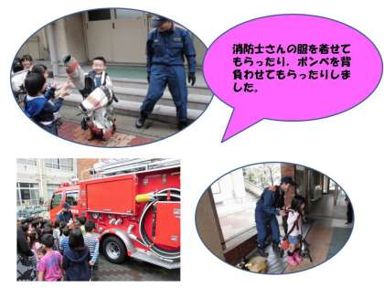5月10日(火)に西京消防署の方にご来校いただき,防火教室をしていただきました。学校には,消防・防火のための様々な設備や道具があります。その役割や意味を教えていただきました。その後,消防自動車の絵を描く予定でしたが,あいにくの天候の為,実施できませんでした。その代わりに,消防自動車をじっくり見せていただいたり,消防の服や器具に触れる体験をさせていただきました。1年生はみんな防火意識をしっかり高めることができました。