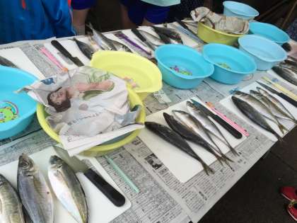 さっそく次の活動「干物づくり」に取りかかります。今から魚を干物にするために包丁を使ってさばいていきます。上手に作ることも大事ですが,海の命をいただくということも忘れずに集中して活動しましょう。