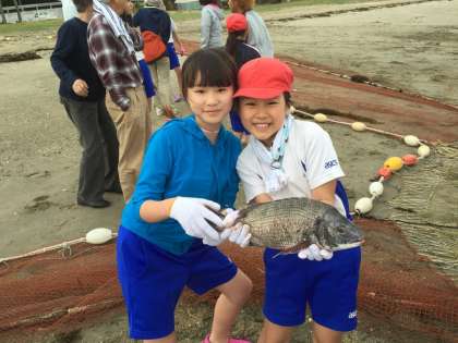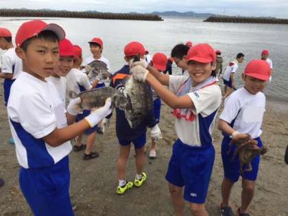 取れた魚を手にし,喜びを爆発させる子どもたち。