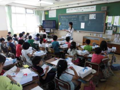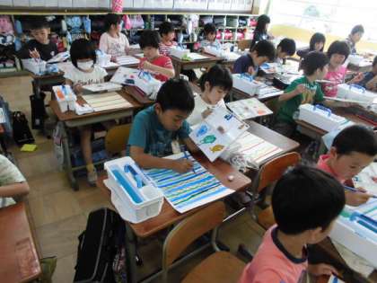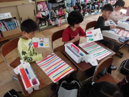 2年生から絵の具を使って図工の学習をしています。今日は色の作り方,筆の使い方などを学習しました。みんなとてもすてきな色づかいで線をかいていました。参観日には,何かに変身して掲示されていますのでお楽しみに!