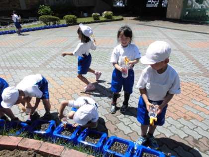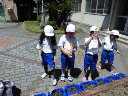 あさがおの種を鉢に植えました。2,3日で芽が出始め,子どもたちは大喜び。