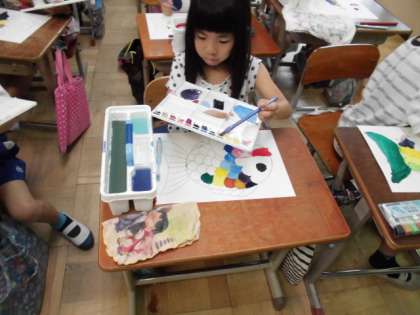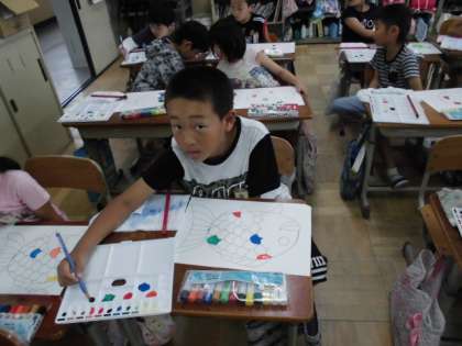今日はたくさんの色の絵具を使って,魚のうろこを丁寧にぬりました。