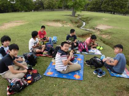 奈良公園の芝生広場でお昼ごはんです。お家の人に用意してもらったお弁当をとてもおいしそうにいただいていますね。