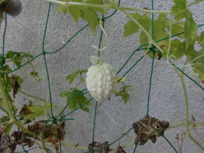 今年も緑のカーテンにアップルゴーヤが実りました。独特の白いゴーヤです。大きくなるのが楽しみです。