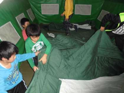 みんなで協力して,寝具準備に取り掛かります。男子も女子も完璧です。