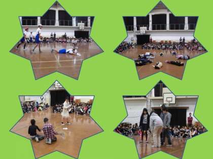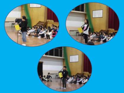 今日は,「みさきの家」で過ごしたたくさんの思い出を,4年生が全校の前で発表しました。実際に起こった出来事を寸劇にして思い出を振り返っていました。