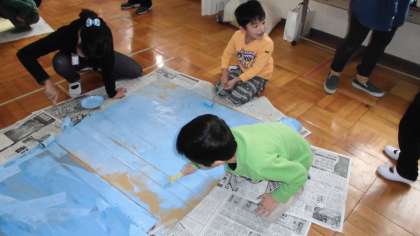 川岡小学校の会場に桂東小学校と川岡東小学校の育成学級児童が集まり「小さな巨匠展」に向けて作品と展示する土台作りをしました。