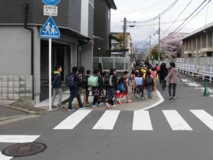 みんな笑顔で安全に気をつけて登校しました。集団登校グループでは,上の学年の子が低学年の子を見守りながら登校しています。