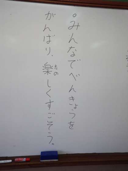 クラスのみんなで頑張っていきたいことを決めようと、子どもたちから意見を出してもらいました。「勉強を頑張りたい。」「みんなで楽しく過ごしたい。」「時間を守ろう。」など、様々な意見が出て、みんなで相談した結果、「みんなで勉強を頑張り、楽しく過ごそう。」となりました。