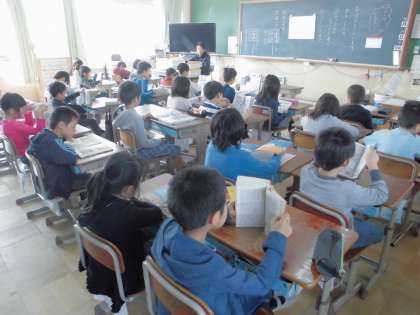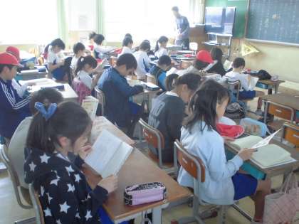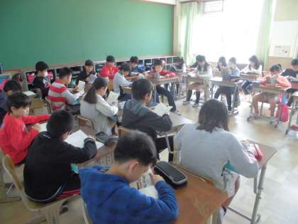 川岡東小学校では朝8時30分から朝読書が始まります。すてきなBGMを聞きながら,自分のお気に入りの本を静かに読む。そんなさわやかな10分間です。どのクラスも聞こえる音はページをめくる音のみ。みんな本の世界に入りこんでいます。