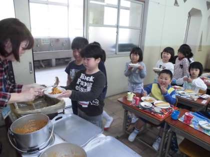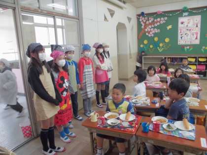 今日は小学校に入学して初めての給食。給食当番の子ども達も少しどきどきしているようです。でも安心してください。なんと6年生のお兄さん,お姉さんがお助けに来てくれたのです。てきぱきと動く6年生の活躍で,給食の準備も終わり,いよいよ『いただきます。』