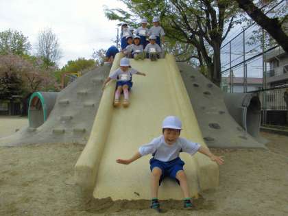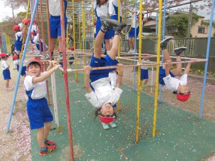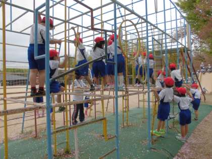 今日は小学校に入学して初めての体育です。どんなことをするのか,ちょっとどきどきしていた1年生。運動場に出て築山や総合遊具,うんていなどの使い方を学習しました。総合遊具では逆上がりを見せてくれる子もいました。