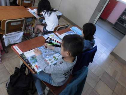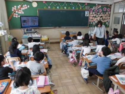バスや動物の数をかぞえ,それに対応する数字を書く学習をしていました。テレビ画面に映し出された絵を見ながら楽しく学習していました。