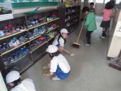 そうじ時間の5分前にはそうじ場所に来てそうじを始める3年生。みんな,おそうじが大好きなのです。そうじをしてきれいになると,気持ちいいですね。