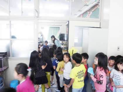 学校探険のグループの顔合わせをしました。まずは2年生が1年生の教室へ迎えに行ってあげました。1年生はちょっとドキドキしているようです。大丈夫ですよ。2年生はとっても優しいお兄さんお姉さんですよ。