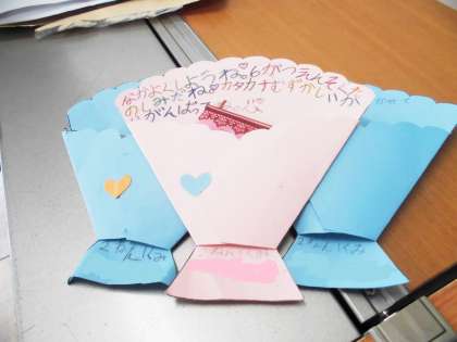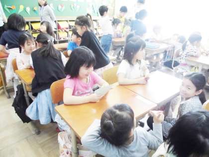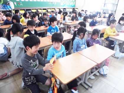 1年生の教室では,なんと2年生から1年生へお手紙とプレゼントがありました。もらった1年生は笑顔の花が満開。あげた2年生も,その笑顔を見てニコニコ。みんなとっても嬉しそうです。