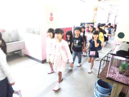 というわけで,体育館へ移動します。ここでも2年生は1年生の手をしっかり握ってリードしてあげていました。そして1年生も静かに並ぶことができていました。