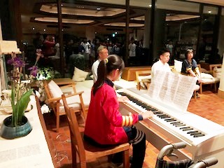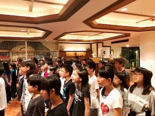 修学旅行1日目最後のイベントは,日間賀観光ホテルで働く皆さんへ感謝の気持ちを伝えることです。最高の景色,最高の食事,最高のおもてなし。本当にありがとうございます。歌う曲は「海の声」です。聞いてください。