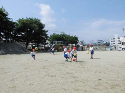 今日はボールに慣れるために,ドリブルをしたり,上に投げてキャッチしたりしました。まだまだ上手にボールを扱えない子もいましたが,安心してください。これからたくさんボールで遊んで,ボールと友だちになりましょう。