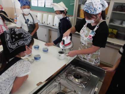 家庭科の学習で「お茶の入れ方」を学習しました。水の量を測り,やかんに入れます。次にガスコンロでお湯を沸かし,茶葉を入れた急須に注ぎます。