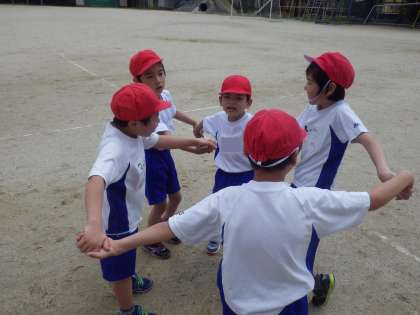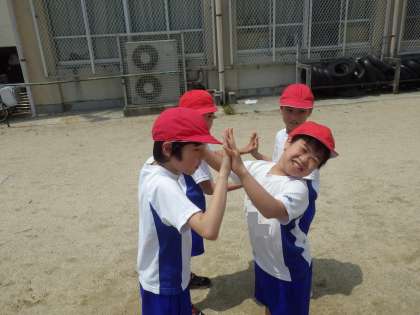 連休明けから体育で「からだほぐし」をしています。背中合せになってお互いを背中に乗せあったり、「なべなべ底抜け」を二人組や全員でしています。また、押し相撲や足相撲では「よ〜い、どん!」の掛け声で、お互い負けないように、力を入れて踏ん張っていました。