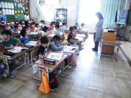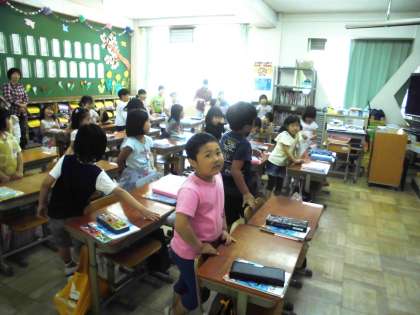 これはどういう違いなのかを今日の学習で学びました。先生に『前から○番目』と言われた子が立っていきます。やっていくうちに『前から○番目』と『前から○人』の違いが分かってきた1年生。