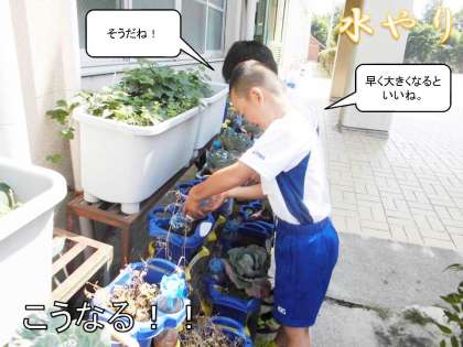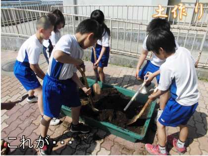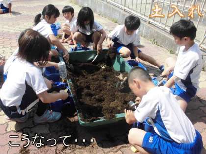 今日は自分の植木鉢にヒマワリとホウセンカのたねまきをしました。まずは土作りから。みんなで力を合わせて土を作ります。そして植木鉢に土を入れ,たねをまきます。