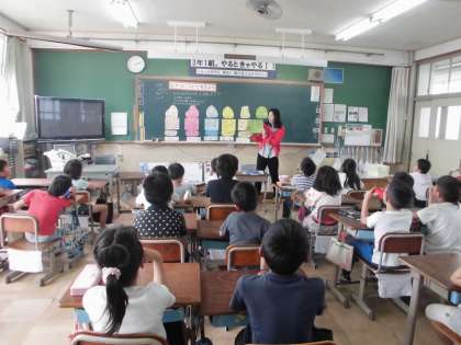 栄養教諭の山田先生に食の指導をしてもらいました。テーマは『おやつについて考えよう』です。
