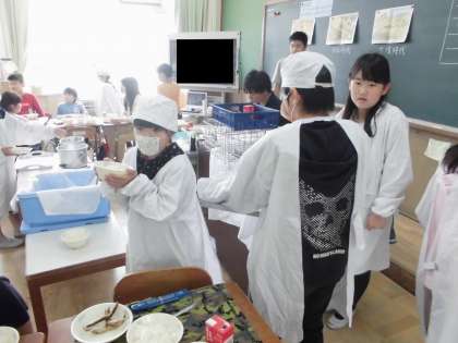 今日の給食は『ご飯,豆乳のみそ汁,野菜のうめおかか,ししゃものからあげ,牛乳』です。今日は配るものがたくさんあるので,給食当番さんも大忙しです。しかし,そこは給食当番歴6年の猛者です。手際よく配膳をすませていきました。
