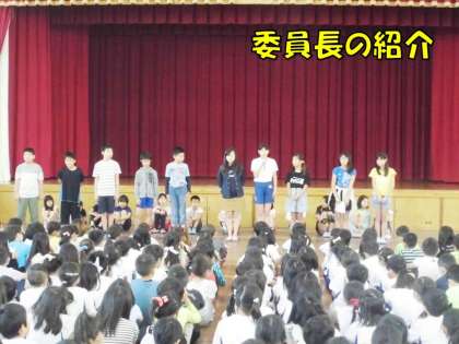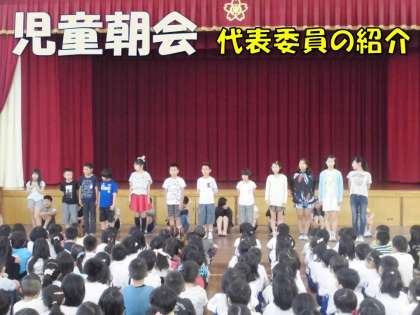 今日の児童朝会で,各クラスの代表委員と各委員会の委員長の紹介がありました。みんなが過ごしやすいすてきな川岡東小学校にするためにがんばってくれることだと思います。そんな代表委員,委員長にみんなから温かい拍手が送られました。