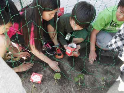 牛乳パックで育ててきた4年生のツルレイシ。今日はツルレイシのお引越しの日です。
