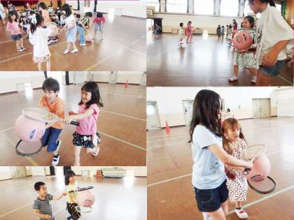 ラケットを使ってボール運びリレー,そして進化ジャンケンです。