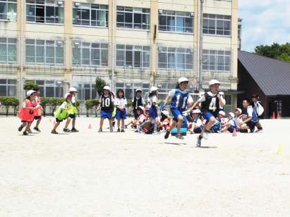 2年生の体育はリレー。今日は先生やチャレンジ体験の中学生も参加しました。息詰まる熱戦が繰り広げられました。最初の頃に比べるとバトンの渡し方,走り方などが良くなってきました。これも練習のおかげですね。