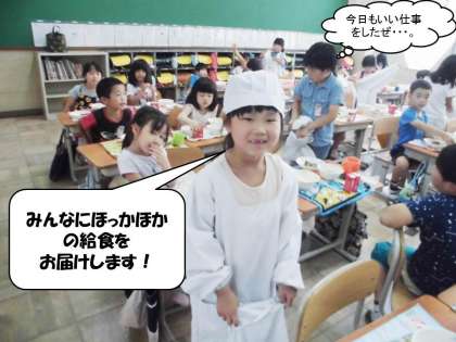 見てください。1年生給食当番のがんばる姿を。そして,当番をやり遂げた後の充実感に満ちた顔を。