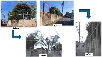 先日(11月8日)に樹木の剪定をおこなっていただきました。しばらくできていなかったので、校庭の樹木が大きく成長し、道路の方にはみ出ていくだけでなく、電線にも架かるようになっていました。地域の方からも心配の声をいただき、万一、強風などで、大きな影響ができることも考えられますので、業者にお願いして、きれいに整理していただきました。