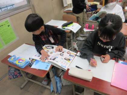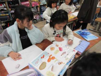 「すがたをかえる大豆」の学習を生かして、いろいろな食品に姿をかえる食材を調べて説明文を書いていきます。今日は、本で調べました。