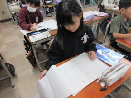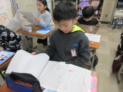 「すがたをかえる大豆」の学習を生かして、牛乳やとうもろこしがどんな食べ物にすがたをかえているかを調べて作文に表しました。今日は友達の作文を読み合い、感想を交流しました。みんなとてもしっかりと調べられていました。