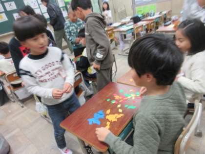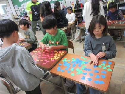 外国語活動で、学んだことをもとにカードづくりをしています。今日は、後半の人がお店やさんになって、いろいろな形の色画用紙をもらうやりとりをしました。習った英語を使って、すらすら話す姿がとても素敵でした。