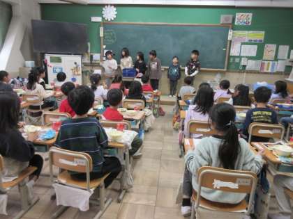 来週、1年生を「みんなが主役 なかよしまつり」に1年生を招待するため、今日は、給食時間に招待状を持って行きました。「え?行っていいの?やったー」「ありがとう」「絶対行く〜!」など言ってもらい、嬉しそうな子ども達でした。